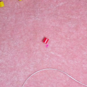 Once you have your thread on your needle, you need to add your stop bead. For this example, I used a red bead. See Photo 01