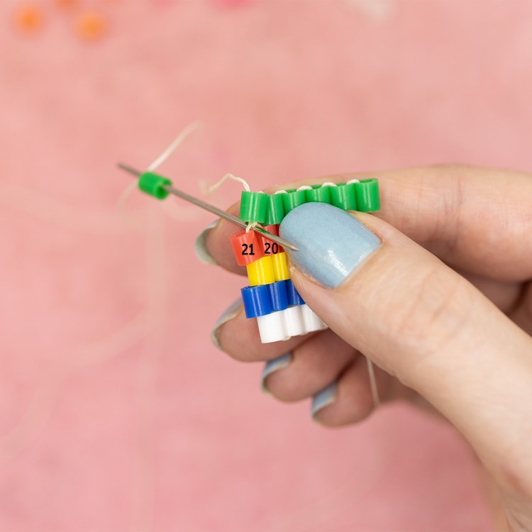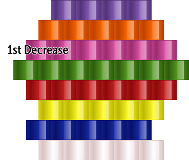 Now it’s time for a decrease. We will be using one less bead in this row, the pink row.