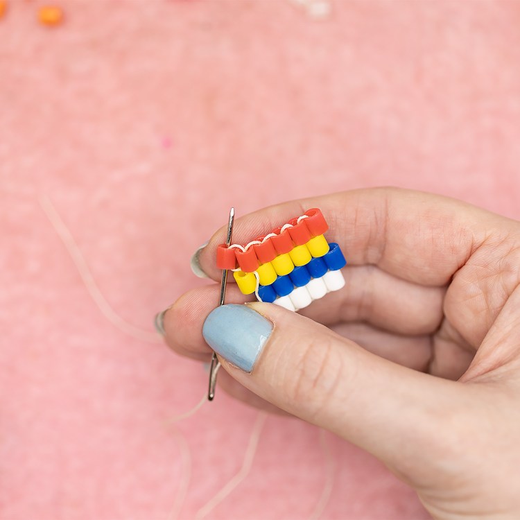 Let’s get started. First, we’ll thread our needle. For brick stitch, you do not need to use a stop bead. We are going to construct a bottom by weaving in and out of the beads. This will create a strong foundation for our beadwork. This is done by creating a row of Ladder Stitch. You can see the tutorial here.